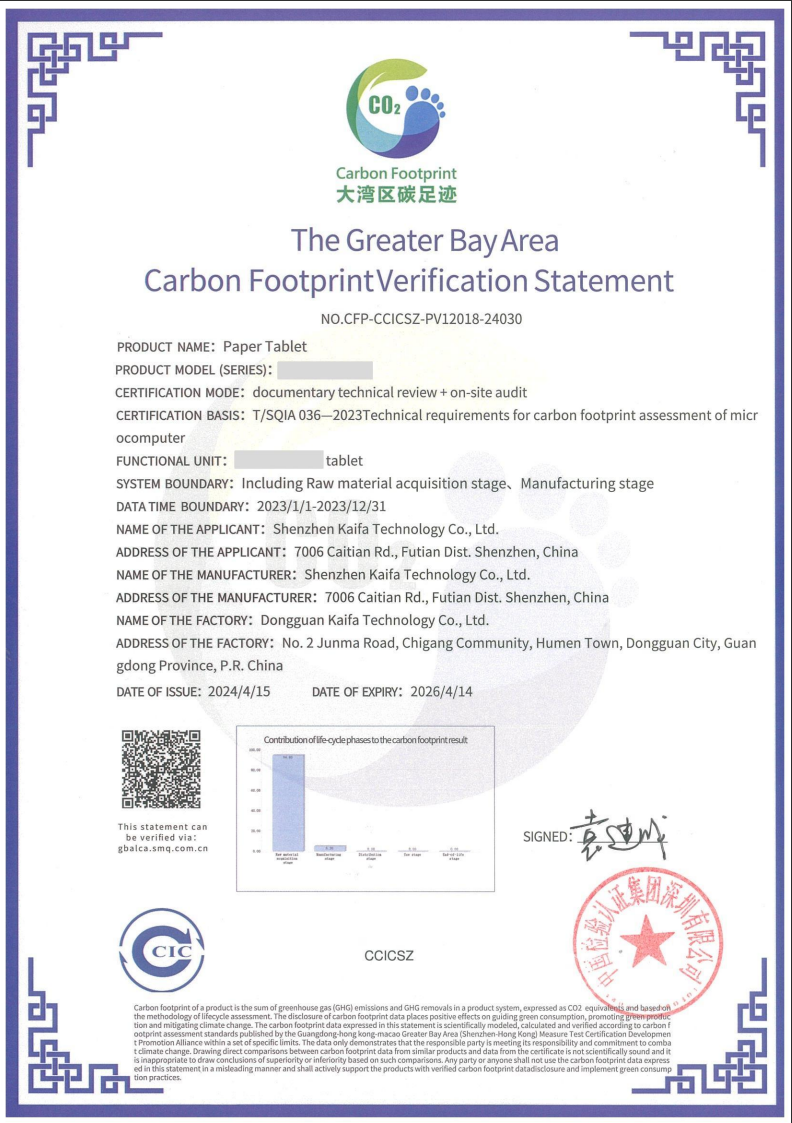 近日,深科技全資子公司東莞長城開發科技有限公司的電子筆記本產品獲得粵港澳大灣區碳足跡標識認證證書,標志著深科技在產品全生命周期碳排放量化和驗證方面取得了重要進展。